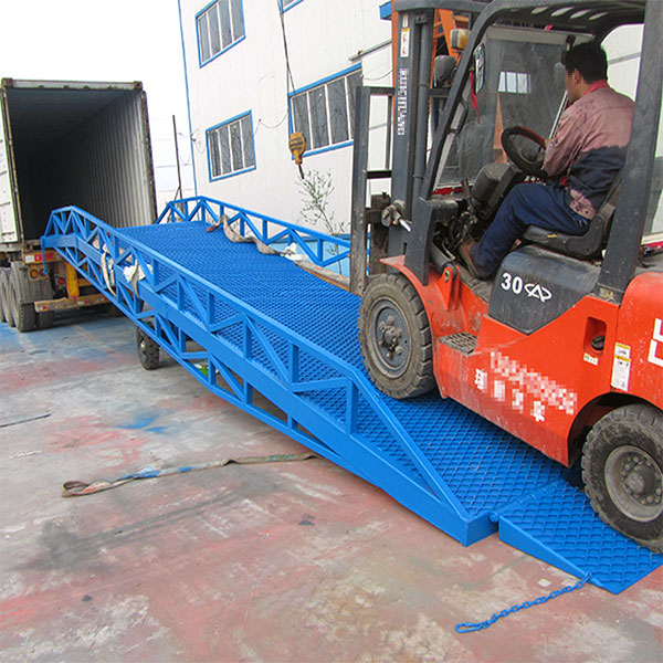 移動登車橋是實現(xiàn)貨物快速裝卸的專用輔助設備,它的高度調(diào)節(jié)功能使貨車與庫房的貨臺之間架起一座橋梁,叉車等搬運車輛通過它能直接駛?cè)胴涇噧?nèi)部進行貨物的批量裝卸,僅需單人作業(yè),即可實現(xiàn)貨物的快速裝卸。移動液壓登車橋使企業(yè)減少大量勞力,提高工作效率,獲取更大經(jīng)濟效益。臺面均設計為網(wǎng)格狀鋼板,這種結(jié)構(gòu)能保證具有很好的強度,又具有防滑功能,還能方便地清掃工作臺面,使它能經(jīng)常地保持清潔、美觀。移動液壓登車橋無須外接電源,通過手搖泵做動力能輕松地在其整個調(diào)整范圍內(nèi)按50mm的倍數(shù)進行高度的調(diào)整??梢猿浞诌m應各種不同高度的貨車.