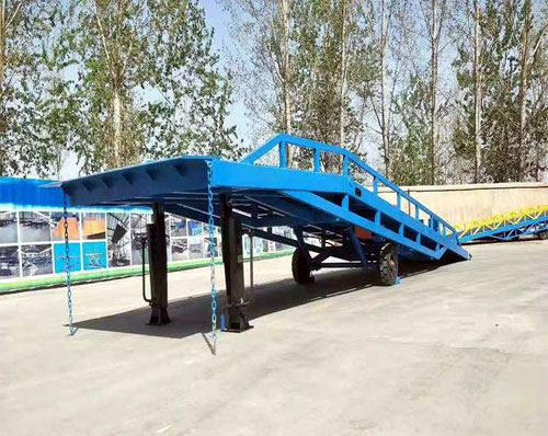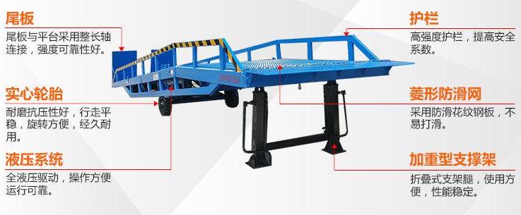 棗莊登車橋-集裝箱裝卸過橋-裝車斜坡登高裝貨叉車液壓登車橋-移動(dòng)式液壓登車橋應(yīng)用于無裝卸設(shè)備的貨臺(tái)及流動(dòng)裝卸場所,是與叉車配合使用的貨物裝卸輔助設(shè)備。借助該設(shè)備,叉車能直接駛?cè)肫囓噹麅?nèi)部進(jìn)行批量裝卸作業(yè)。只需單人操作,不需要?jiǎng)恿﹄娫矗纯蓪?shí)物的安全快速裝卸。即可使您減輕勞動(dòng)強(qiáng)度,又能成倍提高裝卸作業(yè)效率,加快物料流通速度,獲取更大經(jīng)濟(jì)效.臺(tái)面使用特制的菱形網(wǎng)絡(luò)板有可靠的強(qiáng)度,能保證長期使用而。它的菱形網(wǎng)狀結(jié)構(gòu),充分保證了防滑性能,使叉車有更好的爬坡性和可操作性。即使在雨、雪罐子。仍能保證正常使用。